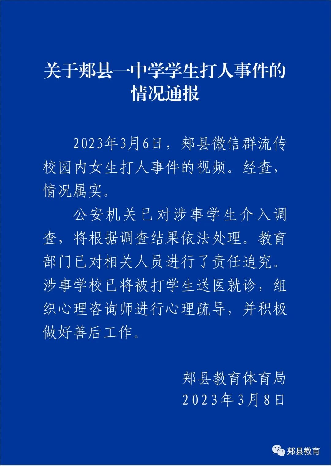 大皖新闻讯据郏县教育微信公众号消息,3月8日,河南郏县教育体育局发布关于郏县一中学学生打人事件的情况通报。